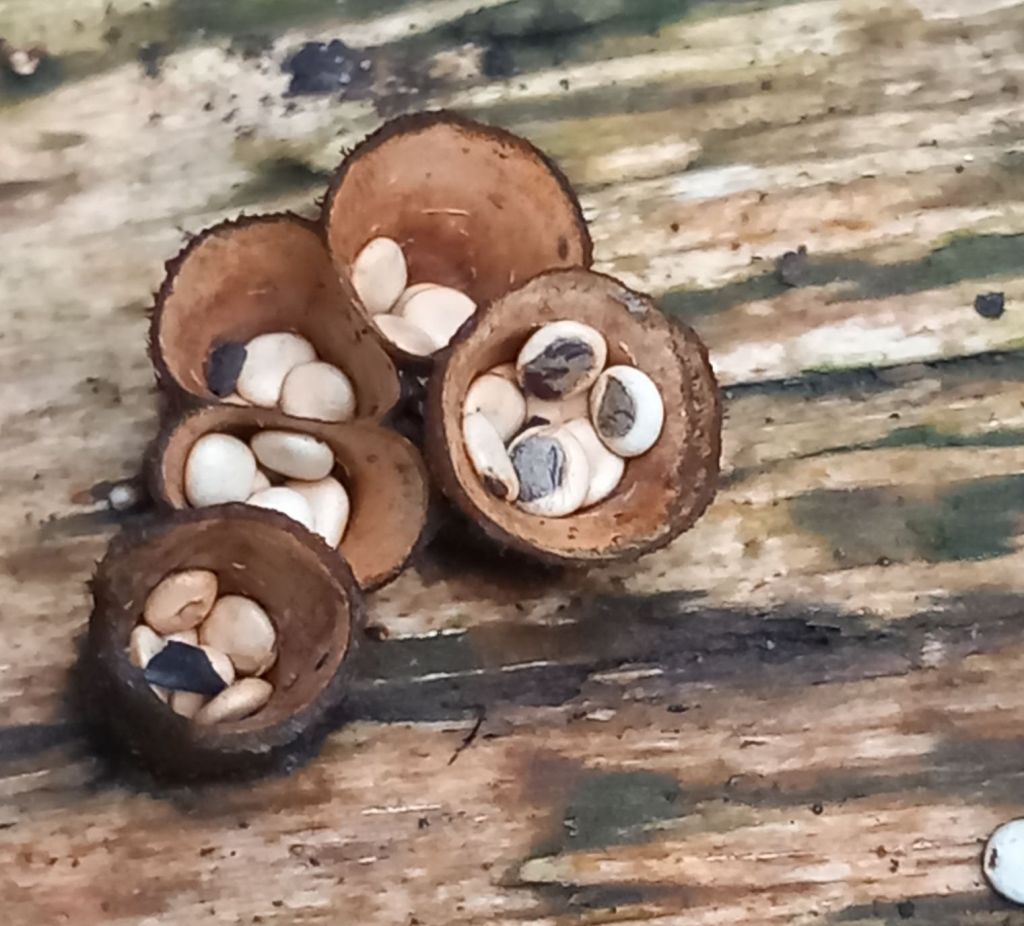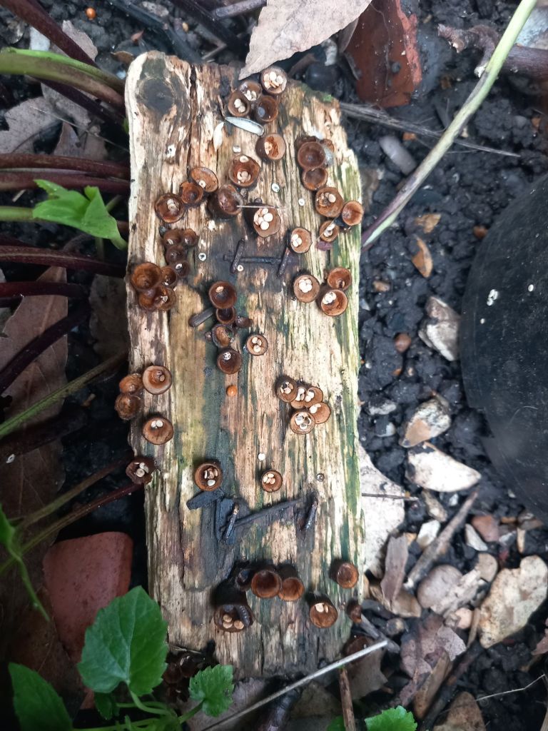 Sticking with the garden, I accidentally rediscovered these little gems, Bird’s Nest fungi. If you haven’t seen them, they are tiny, with each little nest less than 1 cm across. The second photo shows them in situ, on an old rotting piece of wooden garden edging.