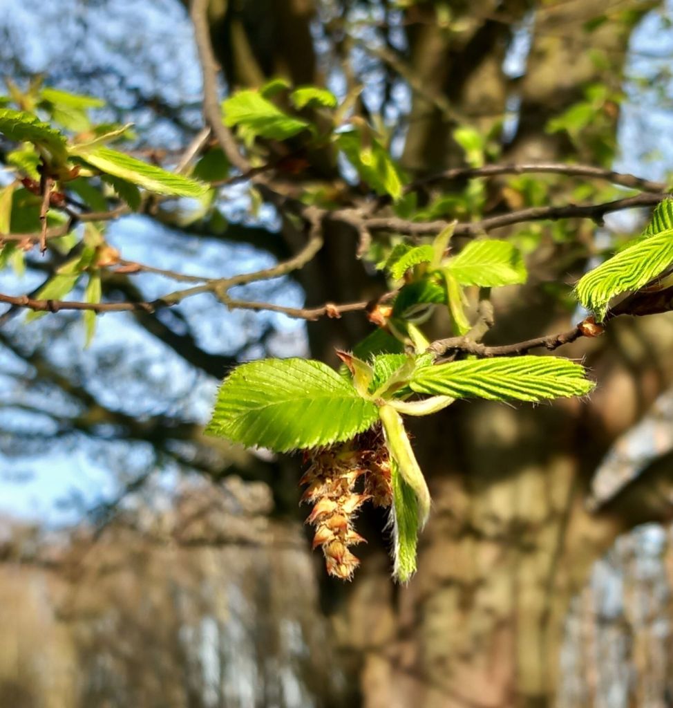 Vivid green leaves are appearing everywhere, as on this hornbeam.